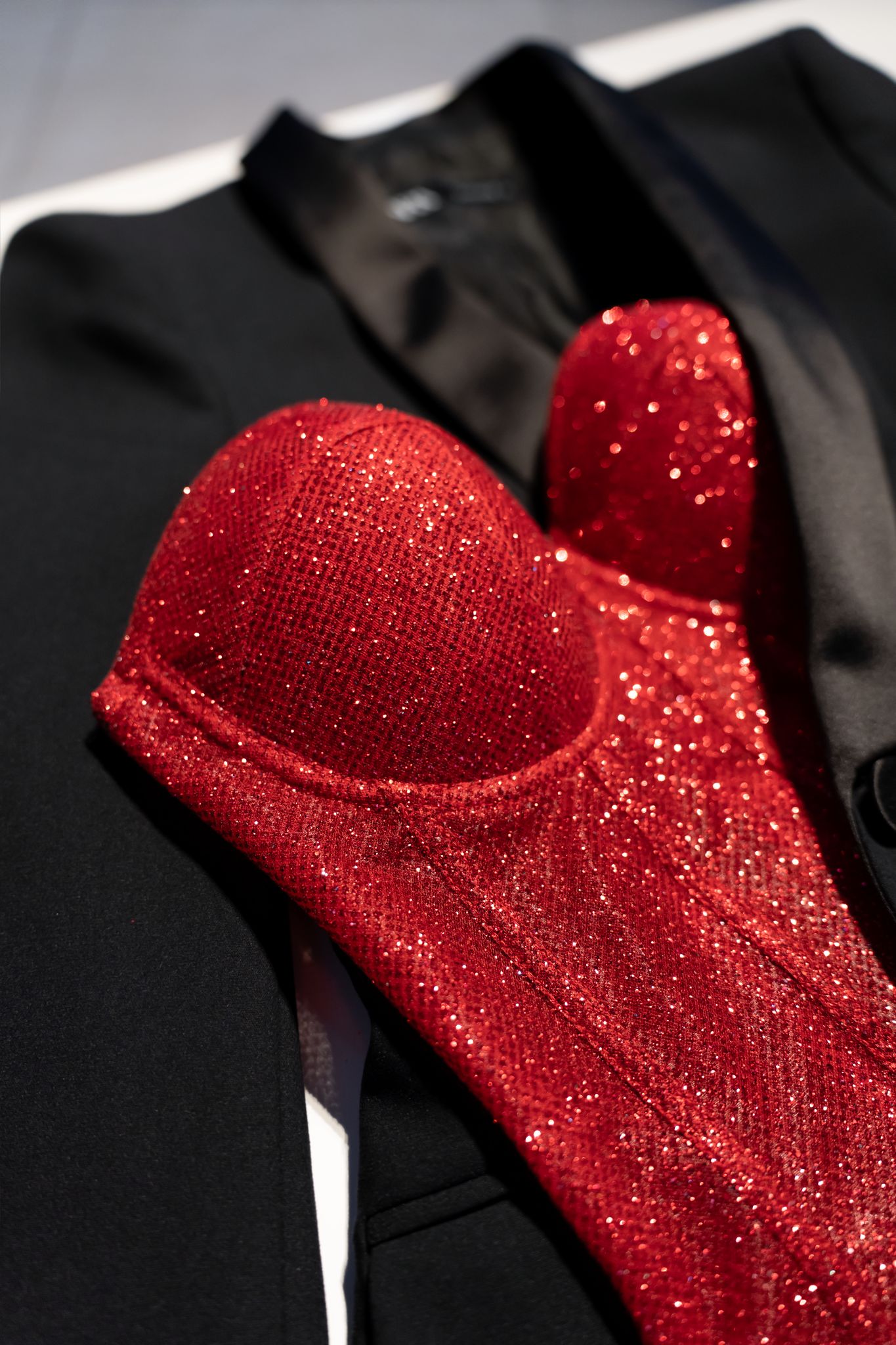 Gorset Mary w intensywnym czerwonym kolorze to kwintesencja kobiecości i pewności siebie. Wykonany z brokatowej tkaniny, która pięknie mieni się w świetle, ten model podkreśla sylwetkę i dodaje blasku każdej stylizacji. Perfekcyjnie dopasowany fason z usztywnianymi miseczkami i fiszbinami gwarantuje komfort oraz idealne podparcie.