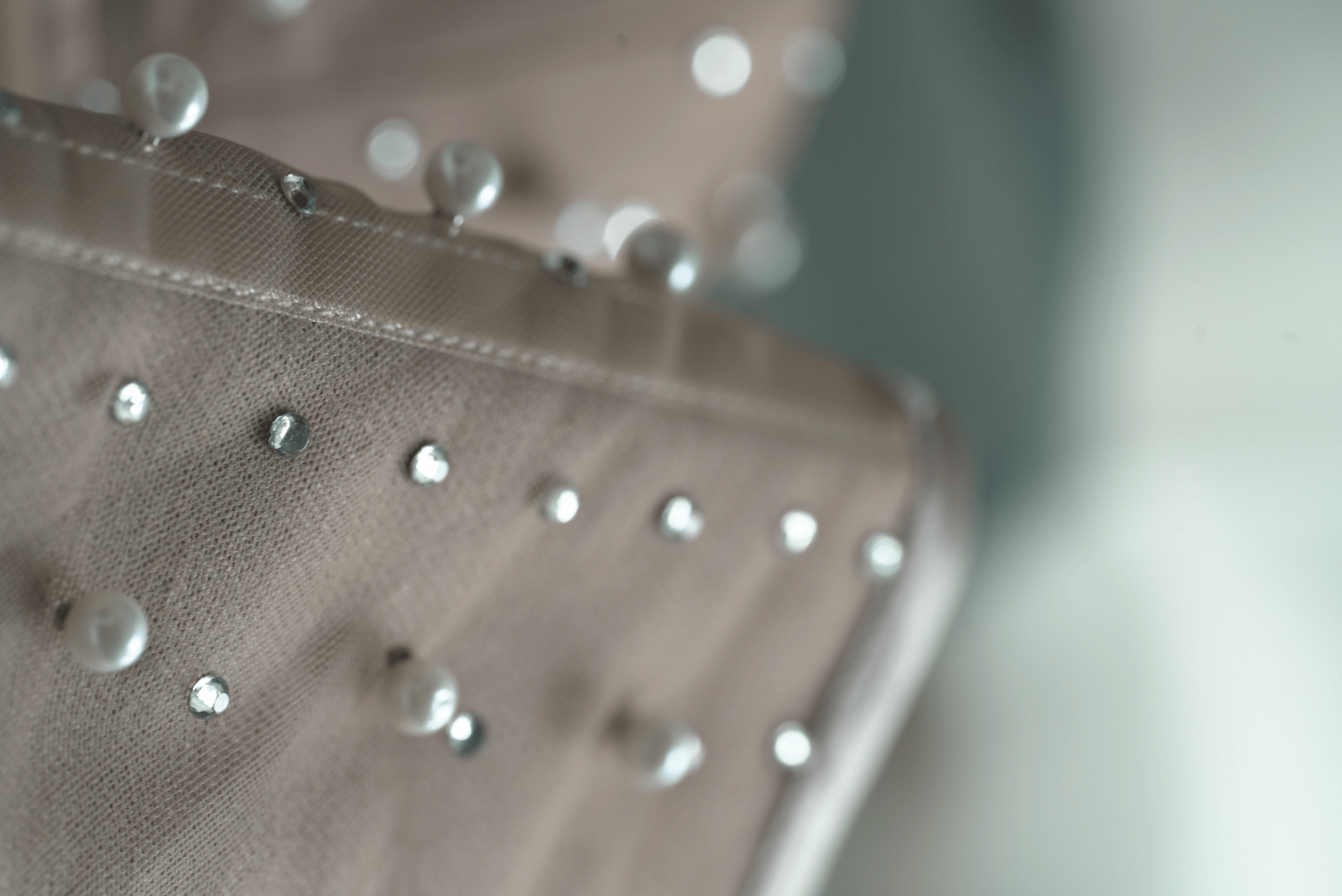Eleganckie materiały: Tiul z perełkami, podszewka i lamówka tworzą doskonałą harmonię, emanującą subtelnością i wyrafinowaniem.