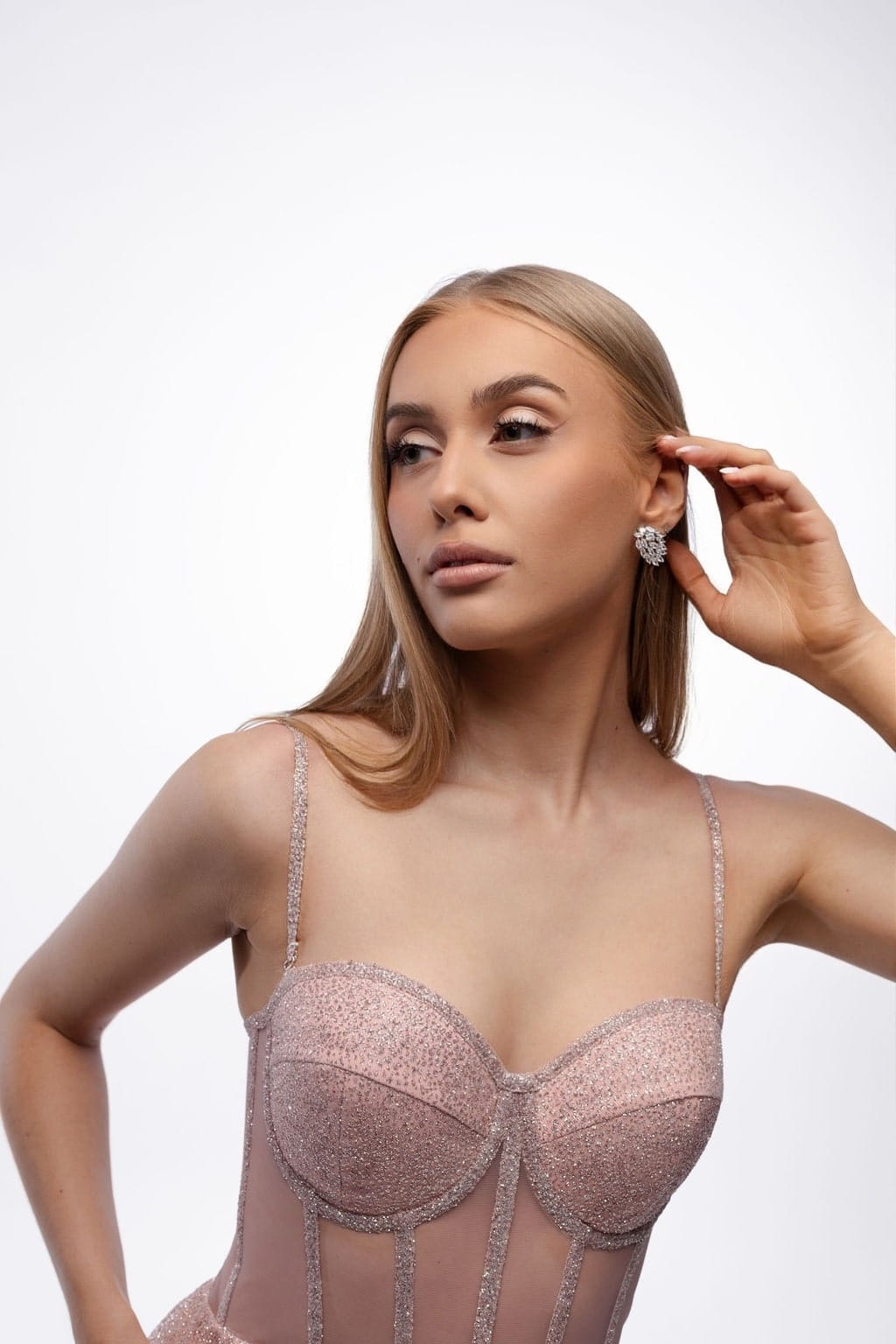 Poznaj sukienkę Sylvia, która łączy w sobie zmysłowość gorsetu i lekkość rozkloszowanego dołu. Wykonana z wysokiej jakości brokatowej tkaniny w odcieniu pudrowego różu, ozdobiona subtelną brokatową lamówką, idealnie podkreśla sylwetkę i przyciąga spojrzenia.