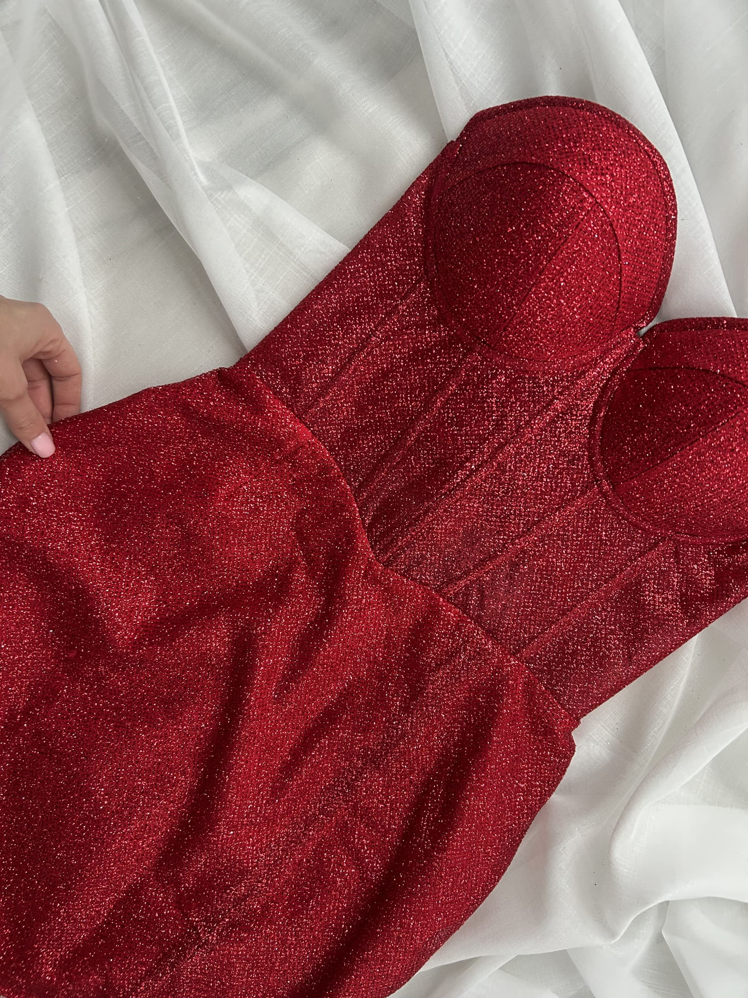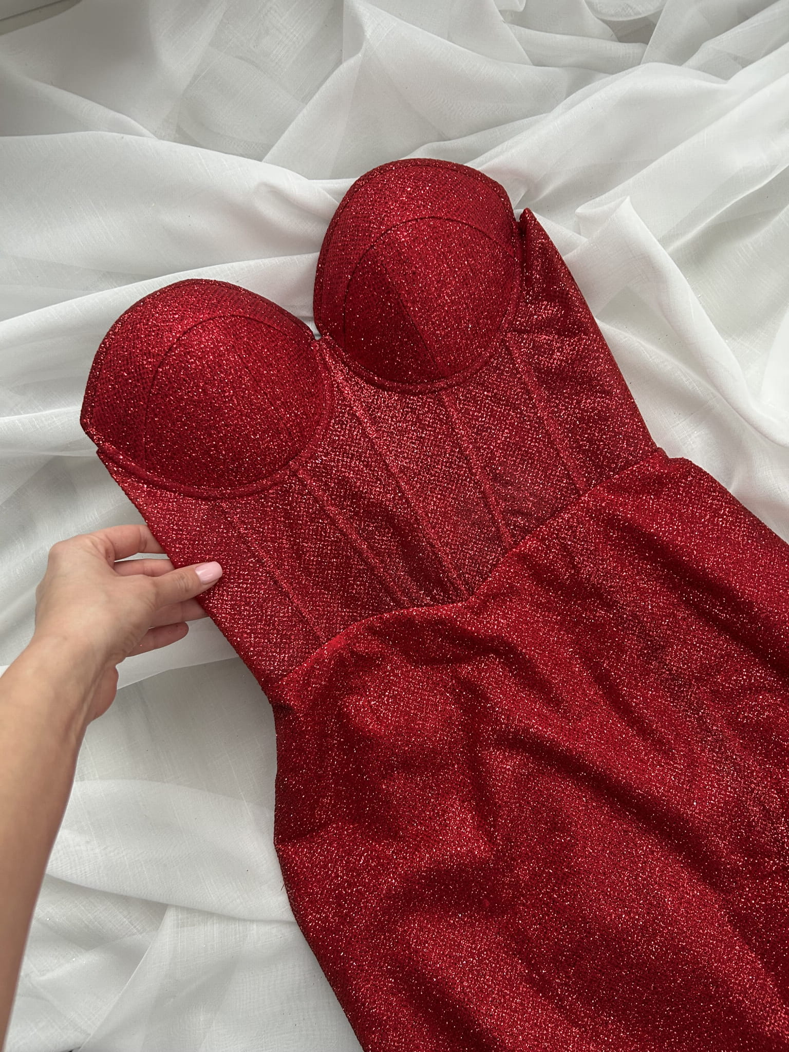 W sukience Mary poczujesz się jak prawdziwa królowa wieczoru! Ten model olśniewa intensywną czerwienią i brokatowym blaskiem, który nie pozwoli Ci przejść niezauważoną. Wykonana z dbałością o każdy detal, doskonale łączy w sobie tkaninę z efektem połysku i usztywniany gorset z wyciętymi miseczkami, który podkreśli Twoje atuty.