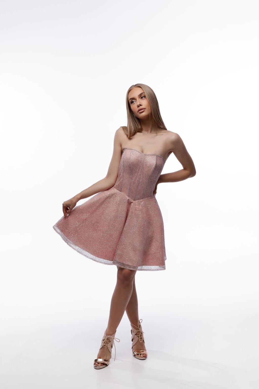 Sukienka Sylvia – rozkloszowany dół i kryta góra, elegancja w pudrowym różu
