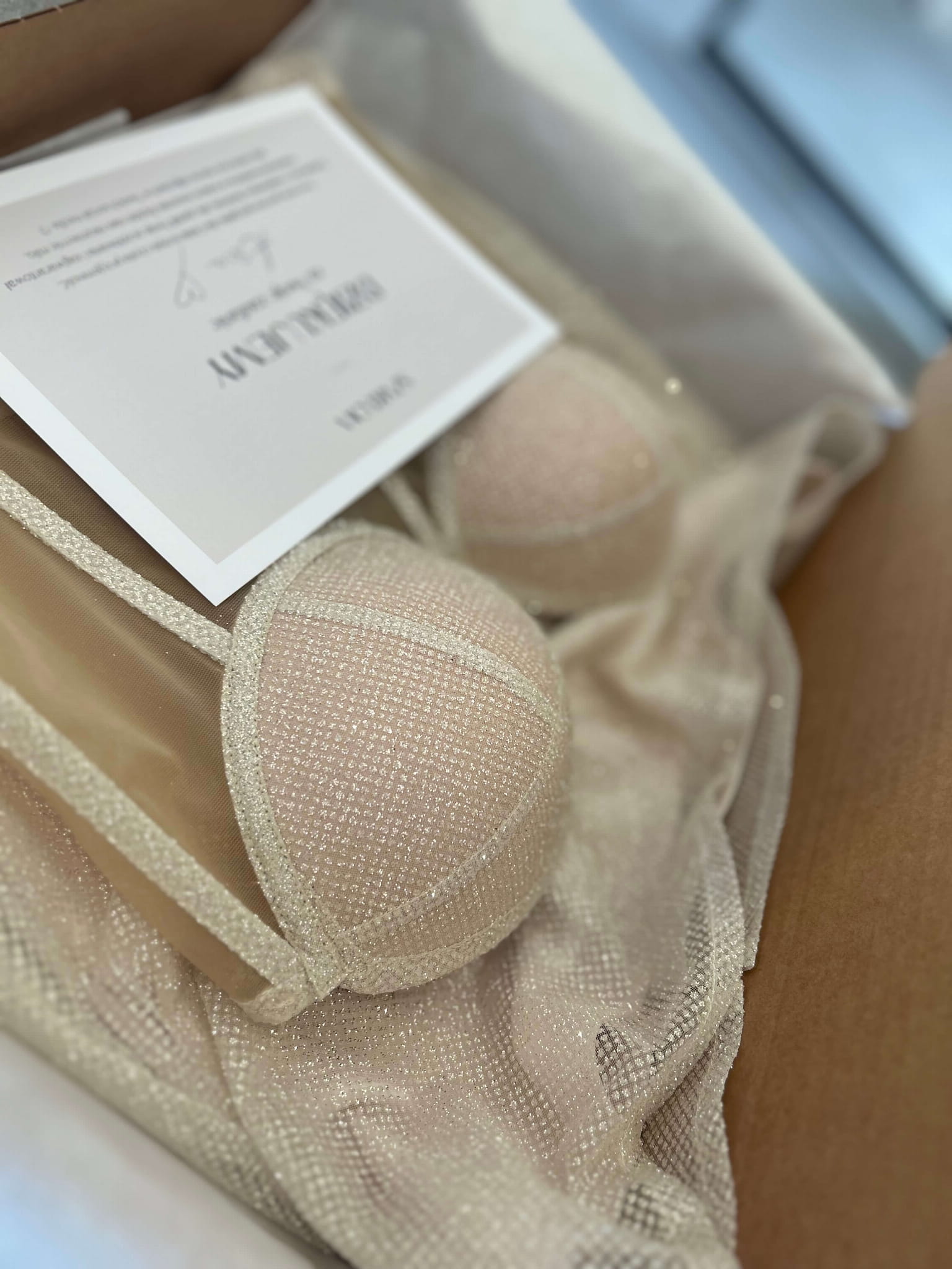 Luksusowe materiały: Podszewka z najwyższej jakości bawełny z domieszką elastanu zapewniająca komfort noszenia przez cały dzień oraz tkanina brokatowa w mlecznym kolorze, która dodaje gorsetowi niepowtarzalnego blasku.